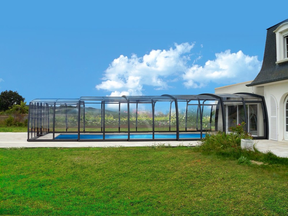 Połączenie zaokrąglonych kształtów i oryginalnych krawędzi sprawia, że wysokość zadaszenia wzrasta minimalnie wraz ze zwiększeniem szerokości. Oznacza to, że nawet w przypadku większych basenów zadaszenie pozostaje eleganckie i dyskretne. OMEGA™ doskonale sprawdza się w dużych ogrodach, przy nowoczesnych budynkach, ale również w klasycznych domach jednorodzinnych, gdzie właściciele oczekują przestronnego zadaszenia basenu.